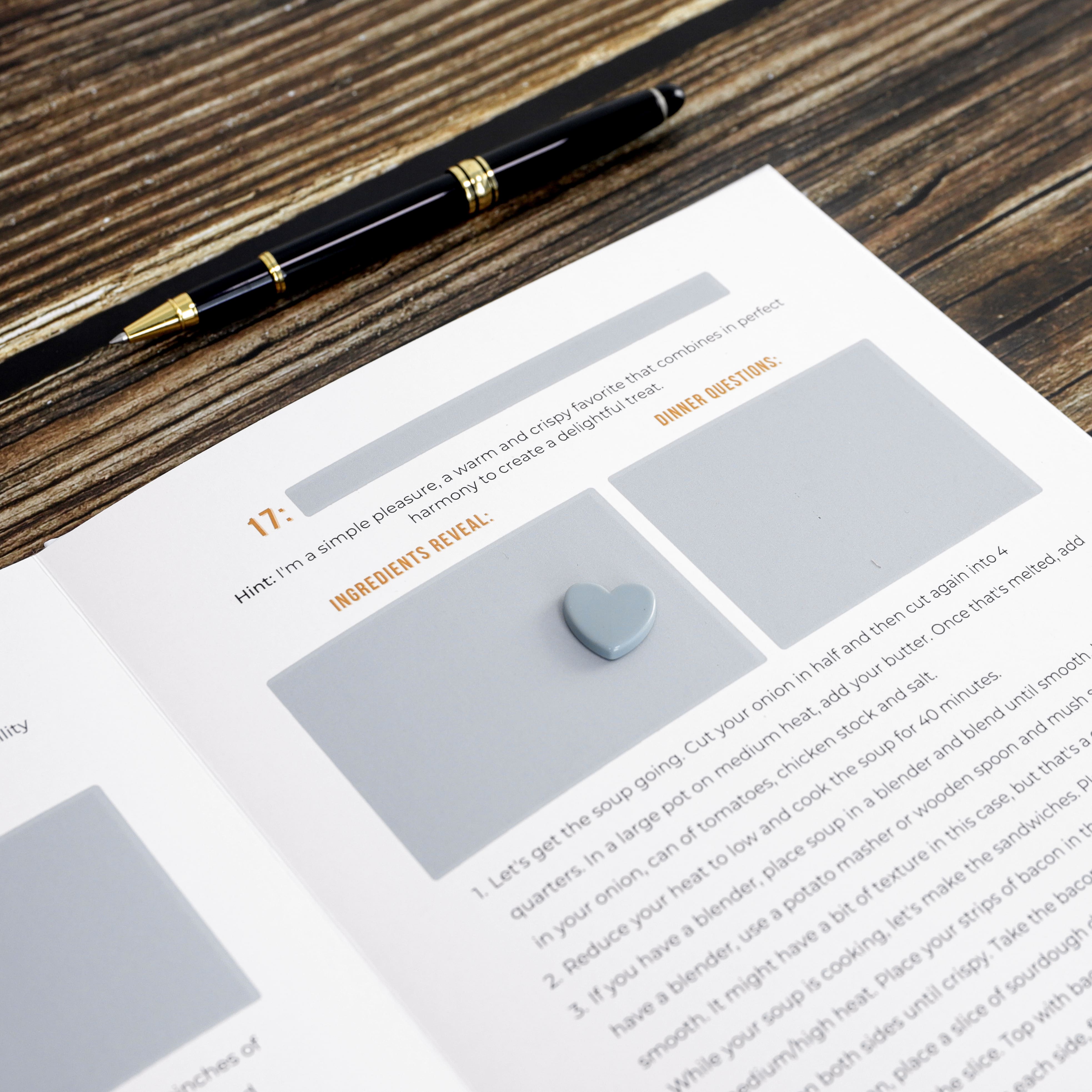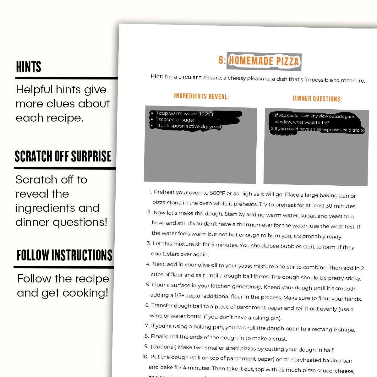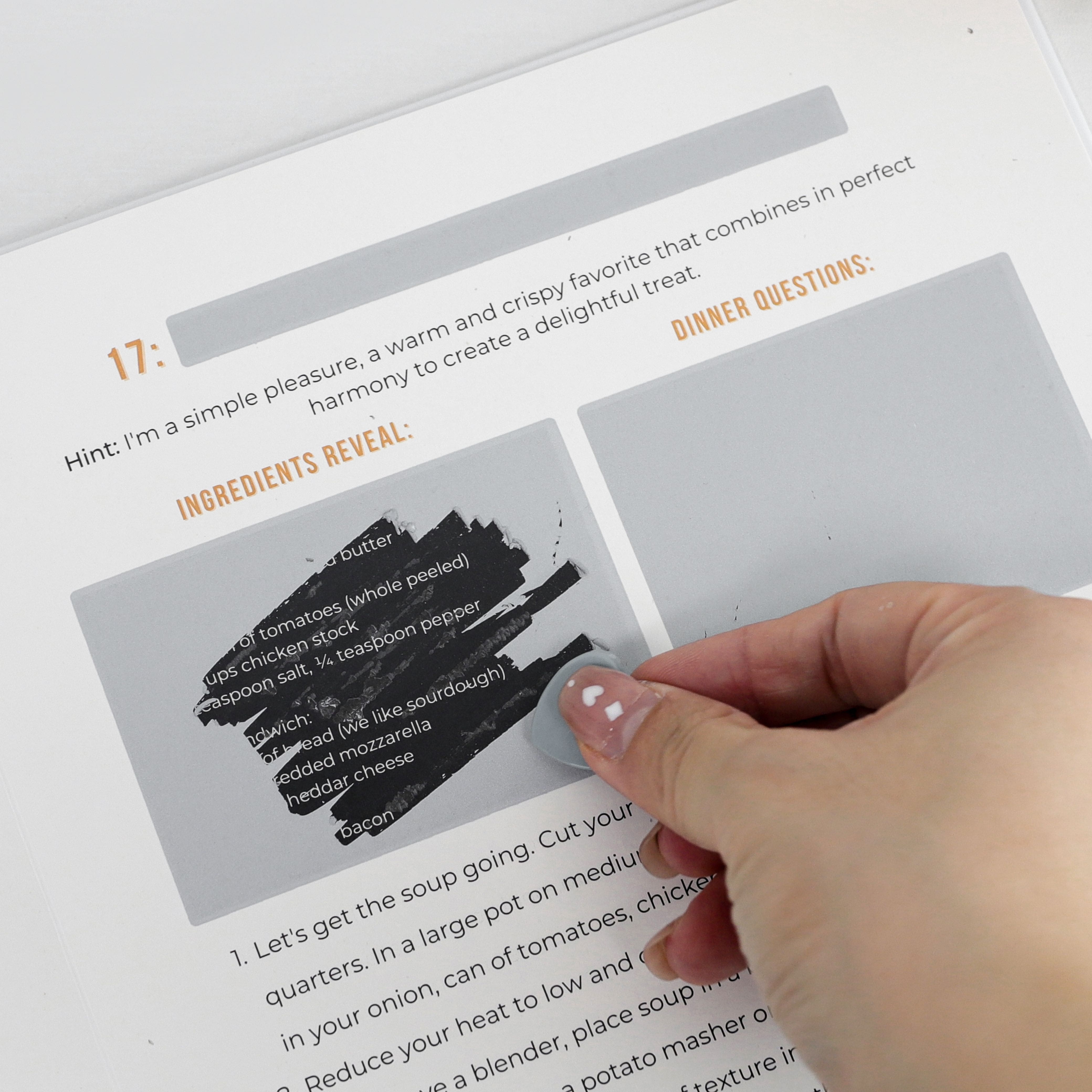 Unlike a normal cookbook, the ingredients in our cookbooks are hidden by scratch-off material like you'd find on a lottery ticket. So it's always a surprise of what you're going to make!